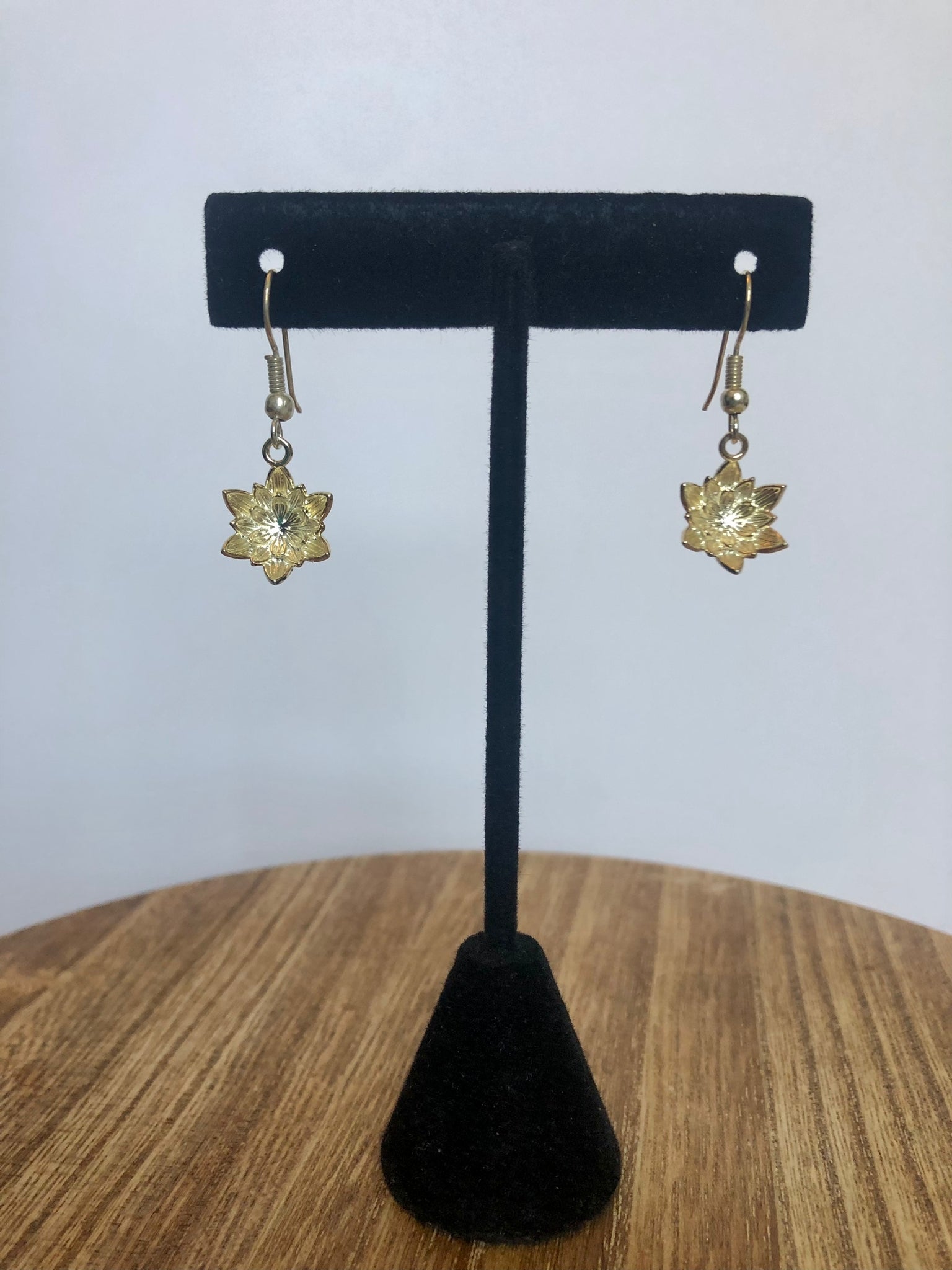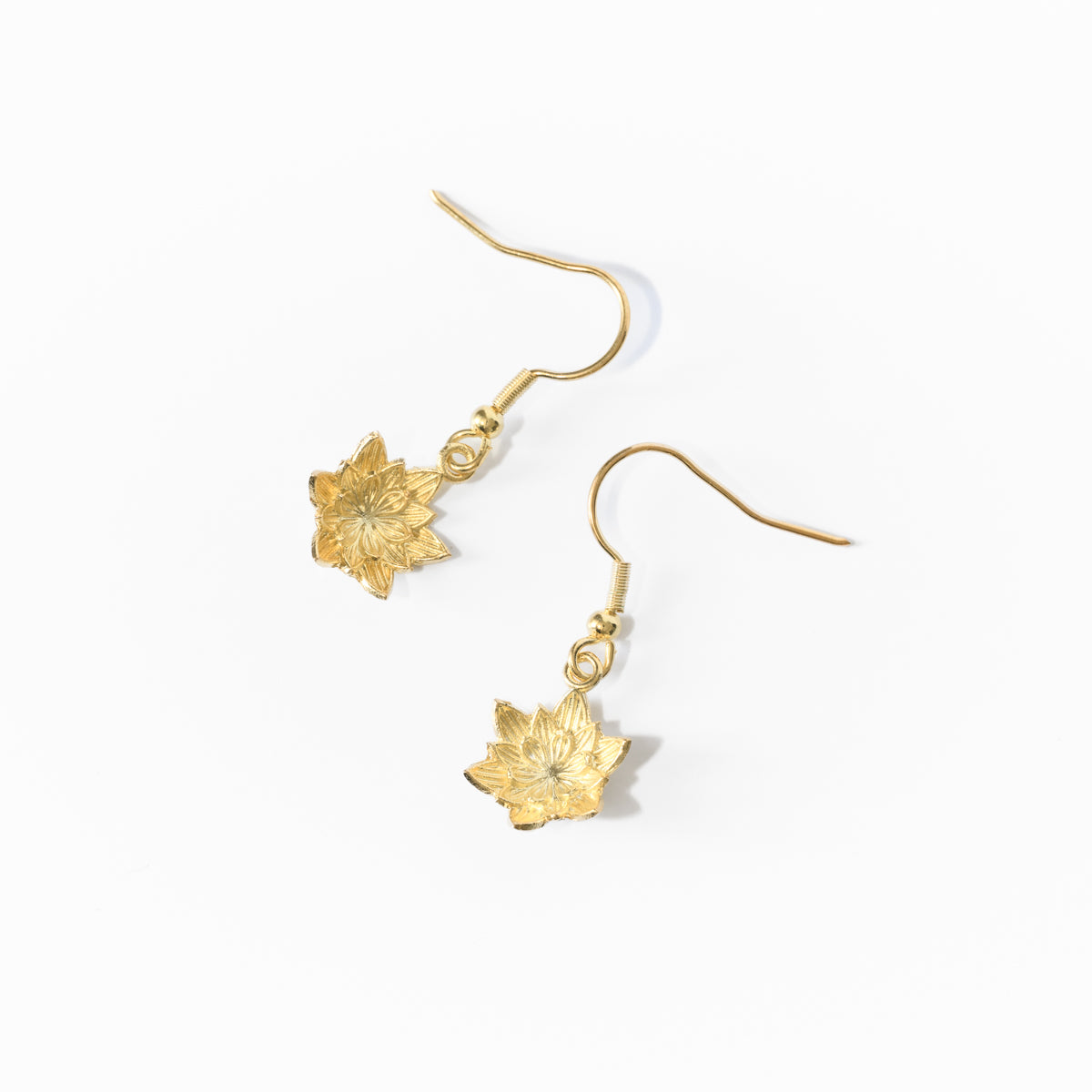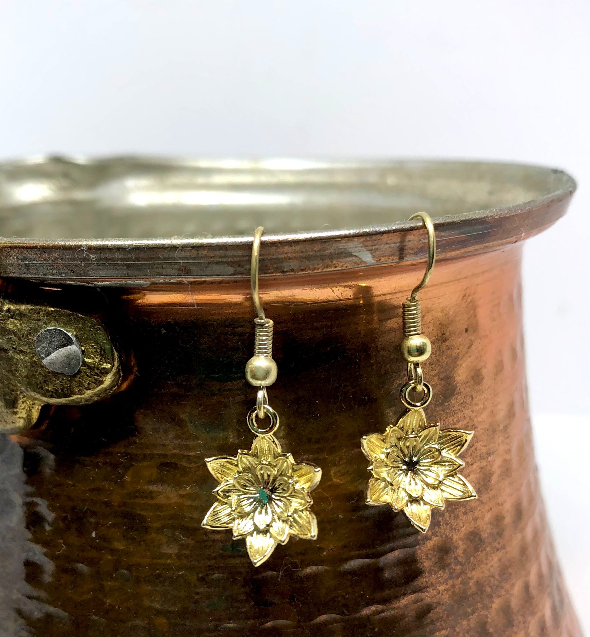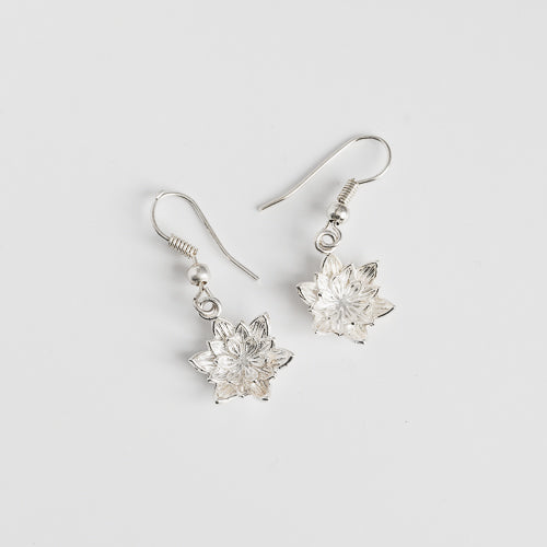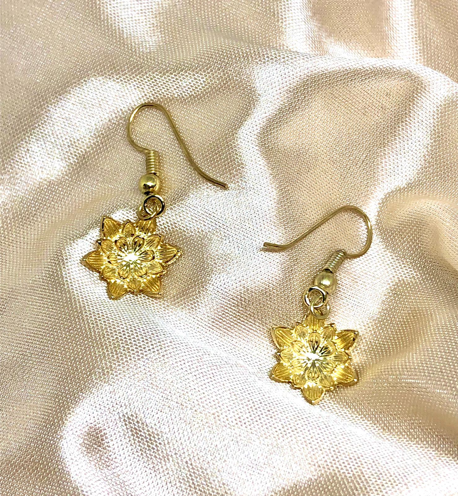 Lotus earrings are intricately detailed dangle earrings inspired by the lively but dainty beauty of a lotus flower. Silver-plated, 14K gold, and Rose gold plated options are available.